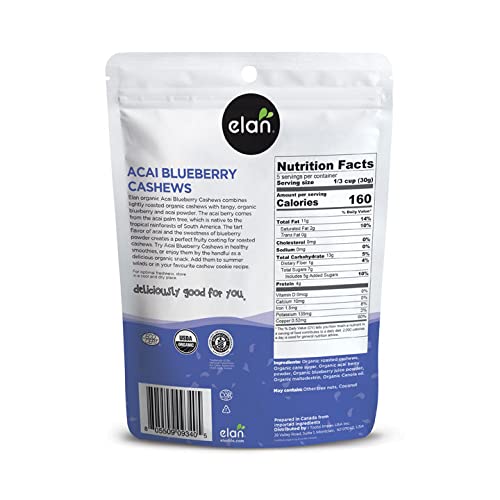 Elan Organic Acai Blueberry Cashews combine the delectable creaminess of roasted cashews, the tangy flavor of blueberries and acai, with the sweetn...